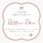 - クリスマスケーキのご案内*クリスマスケーキ予約受付*大変お待たせしました。今年も数量限定で販売いたします。 ■ 予約受付開始12/2(火) 20:00〜公式LINEより ■ お渡し日12/24(水) 14:00〜18:0012/25(木) 14 […]